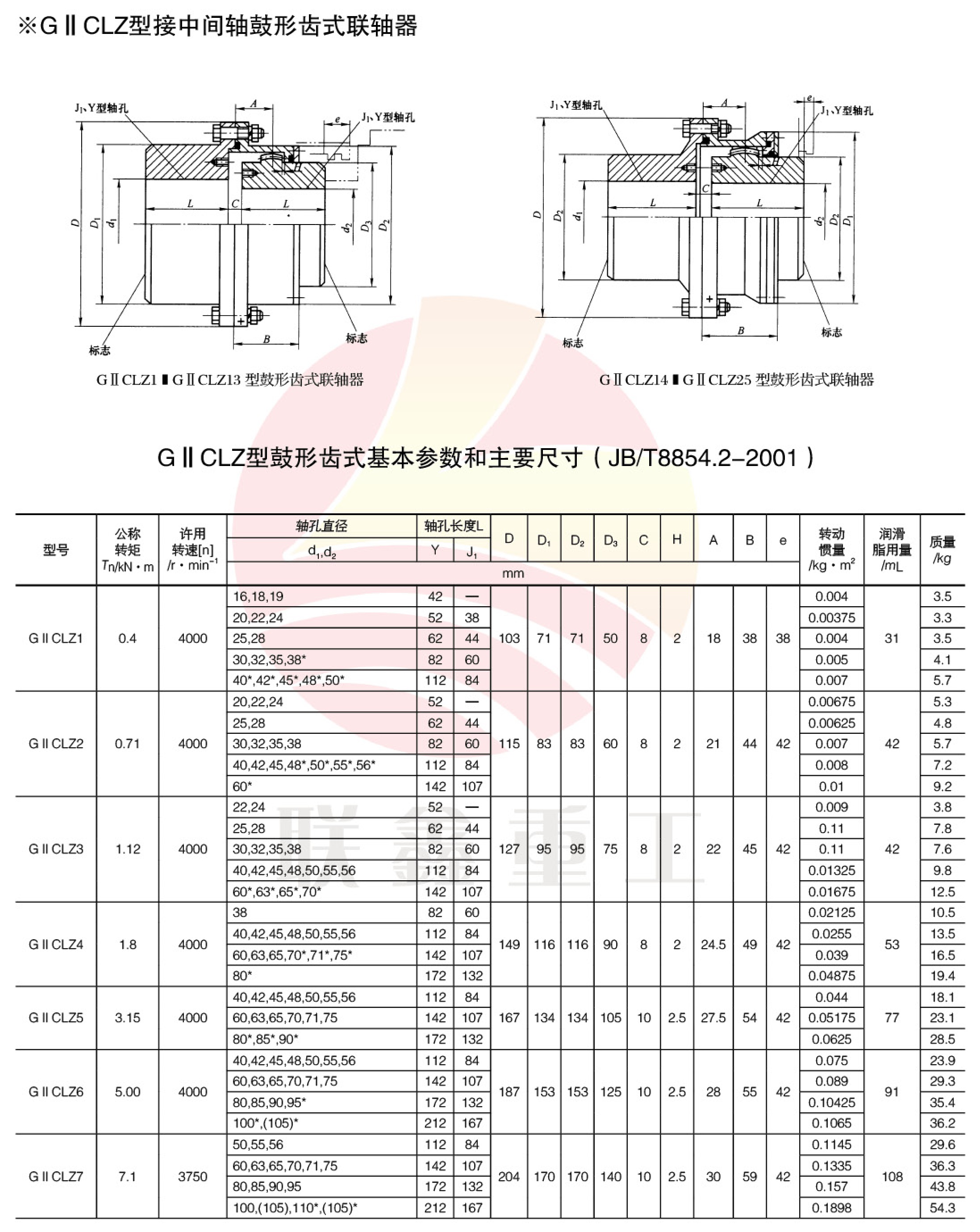 GIICLZ型鼓形齒式聯(lián)軸器 特點(diǎn)及應(yīng)用場合:具有少量軸線偏移補(bǔ)償性能,不能緩沖、減振。外形尺寸小,理論上傳遞轉(zhuǎn)矩大,需要潤滑、密封,但噪聲較大、價格貴,用于聯(lián)接水平兩同軸線軸系傳動。用于低速、重載工況條件下聯(lián)接水平兩同軸線,如冶金機(jī)械、重型機(jī)械等。不適用于高速、高精度的軸系傳動,起動頻繁、正反轉(zhuǎn)多變的工況不宜采用。
