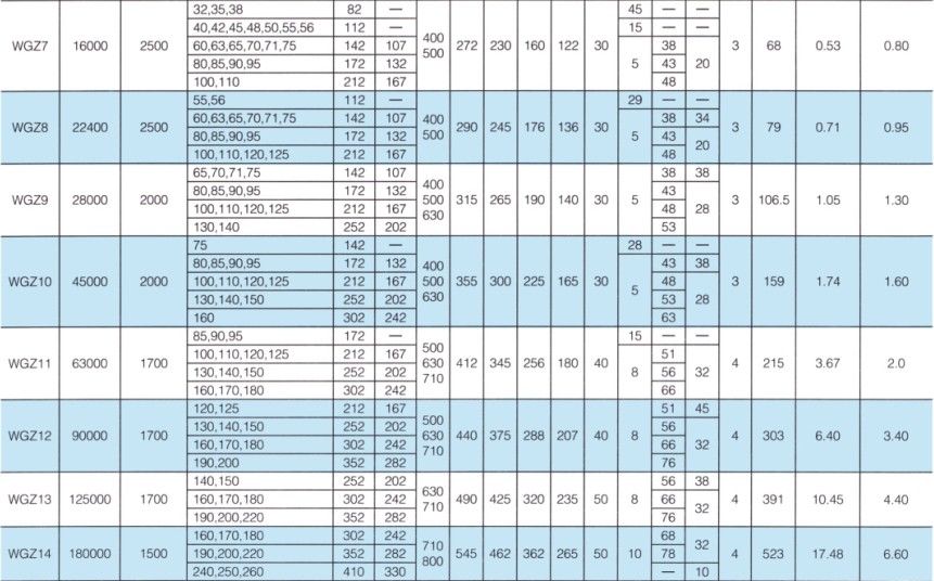 WGT型--接中間套型,適用于兩軸長距離聯(lián)接,許用轉(zhuǎn)速[n]取決于中間套的長度和質(zhì)量,并應(yīng)驗算臨界轉(zhuǎn)速;