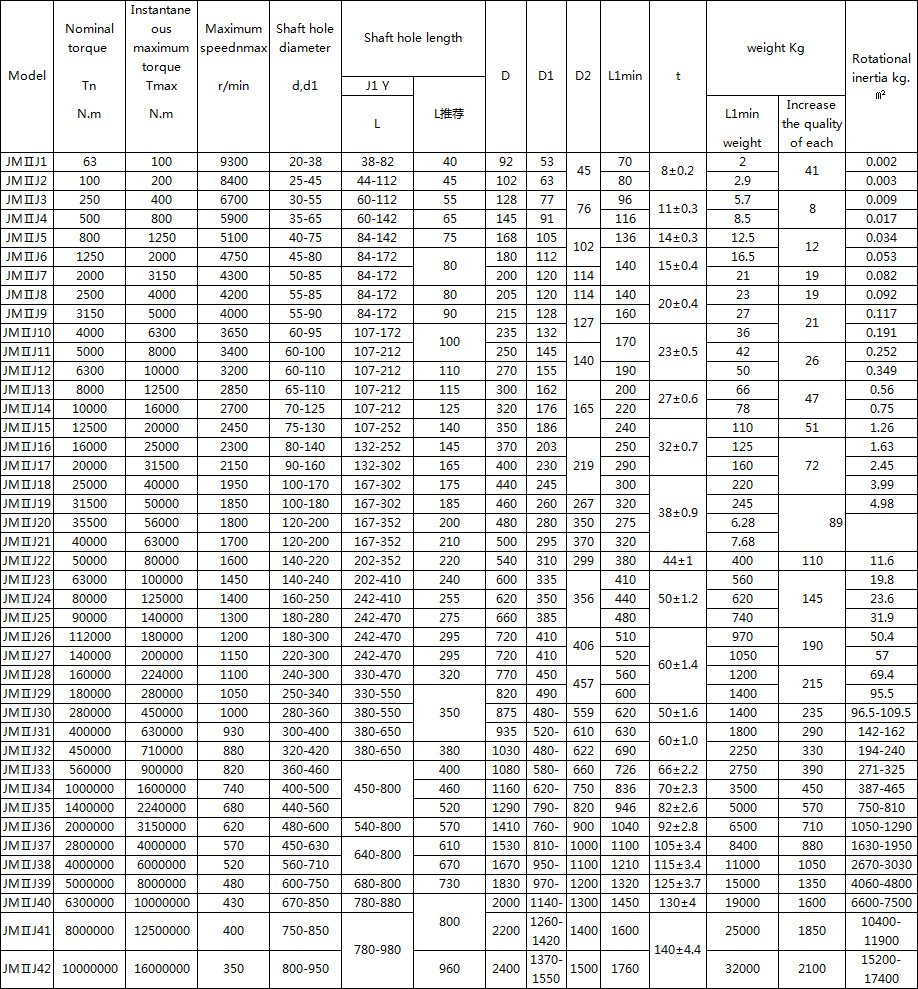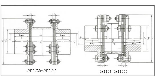 Features and application of JMIIJ diaphragm coupling: Compared with flexible joints of metal elastic components, it has high mechanical strength, large bearing capacity, light weight, small size, high transmission efficiency and high transmission accuracy, and good reliability. Easy to remove and so on. Suitable for medium, high speed and large torque shaft drive. Compared with the drum-shaped gear coupling, it has no relative sliding, no lubrication, long service life, no noise, simple structure and so on. It can partially replace the drum-shaped toothed auxiliary device. Not affected by temperature and oil. It has the characteristics of acid resistance, alkali resistance and corrosion resistance. It can be used in high temperature, low temperature and working conditions with oil, water and corrosive media. It is suitable for shafting transmission with little change in load of various mechanical devices. It is extremely versatile and has been widely used in industrialized countries. It is a high-performance flexible coupling 重點(diǎn) which is mainly promoted and applied in China. High-precision diaphragm coupling can be used for High speed conditions. Compared with the toothed coupling, the diaphragm coupling has no relative sliding, no lubrication, no sealing, no noise, no maintenance, and is convenient to manufacture. It can partially replace the gear coupling. The diaphragm coupling has been widely used in industrialized countries in the world. In practical applications, the intermediate shaft type is generally adopted to improve the offset compensation performance of the two axes. JMI type - basic type with countersink; JMIJ type--with countersunk and intermediate shaft type; JMII type - no counterbore basic type; JMIIJ type - no countersinking intermediate shaft type; ![]() ![]() |