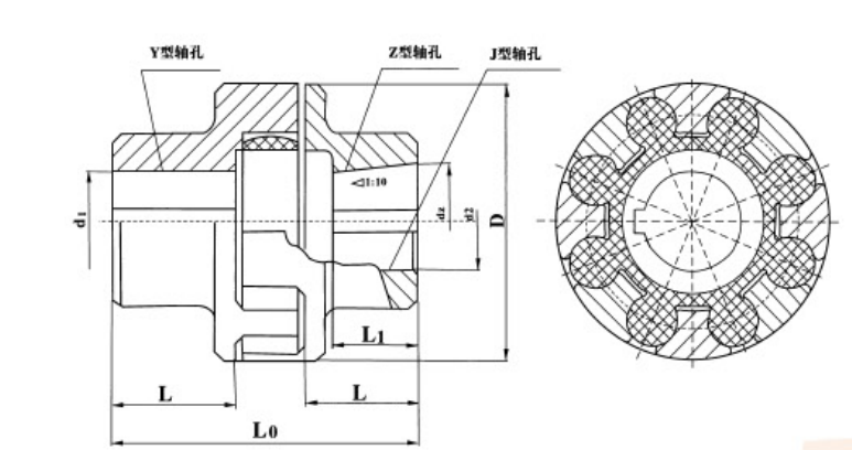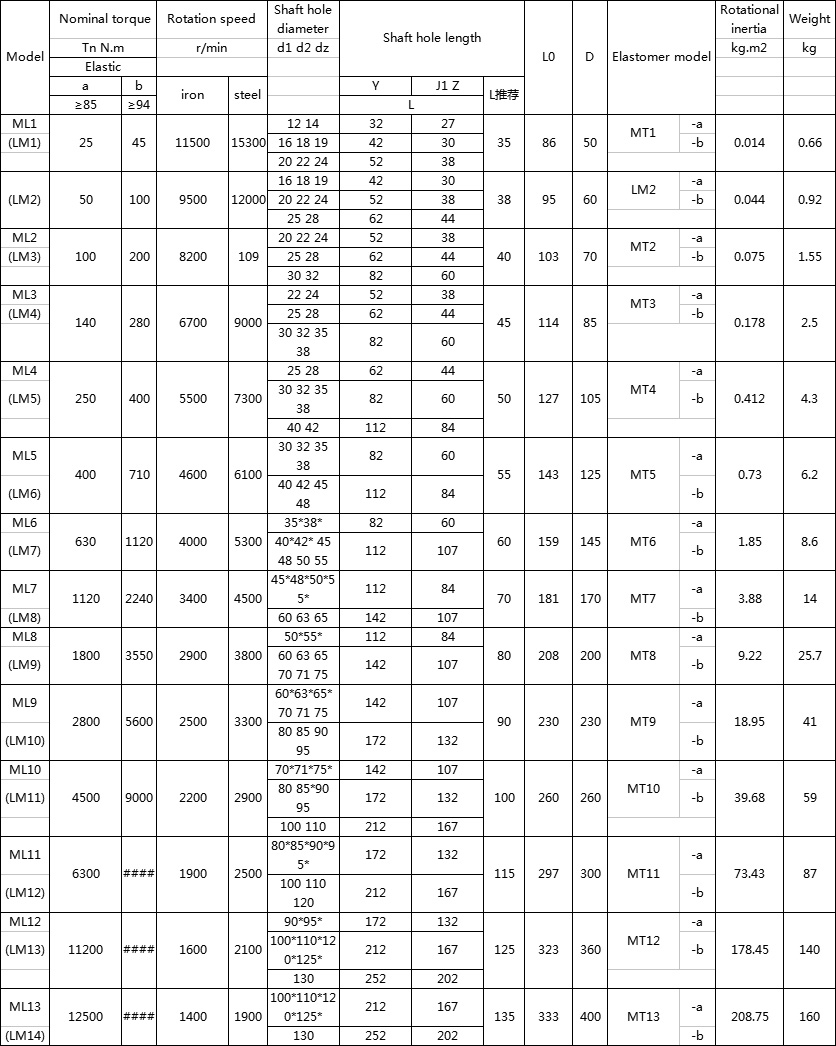 ML (LM) type plum-shaped elastic coupling features and applications: with compensation for two-axis relative offset, vibration damping, cushioning performance, small radial size, simple structure, no lubrication, high bearing capacity, maintenance, The elastic element needs to be moved axially (except for the MLS type). It is suitable for connecting coaxial lines, frequent starting, positive and negative rotation changes, medium and medium torque transmission shafting and working parts with high reliability. It is not suitable for heavy-duty, low-speed and axial dimensions. It is difficult to replace the two components after the elastic components are replaced.
