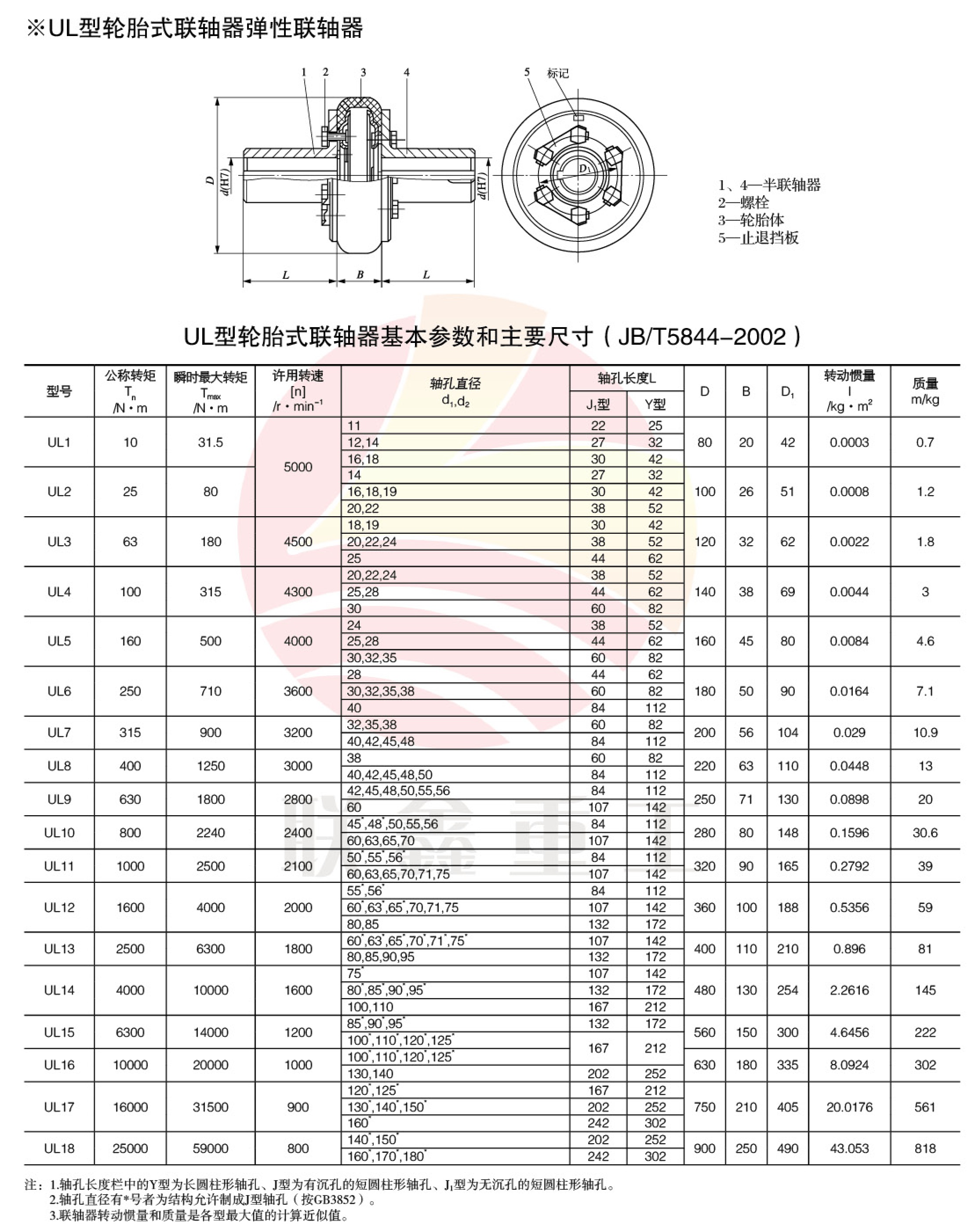 UL型輪胎式聯(lián)軸器 特點(diǎn)及應(yīng)用場合:有較高彈性,扭轉(zhuǎn)剛度小,減振能力強(qiáng),補(bǔ)償量較大,有良好的阻尼,結(jié)構(gòu)簡單,不用潤滑,裝拆維護(hù)方便.噪聲小,徑向尺寸大,承載能力低,過載時(shí)產(chǎn)生較大軸向附加載荷,使用壽命取決于橡膠產(chǎn)品質(zhì)量,適用于起動頻繁,正反轉(zhuǎn)多變、沖擊振動較大的軸系傳動,可在有粉塵、水份工況環(huán)境下工作,不適用于高溫、高速、大轉(zhuǎn)矩和低速重載工況條件。