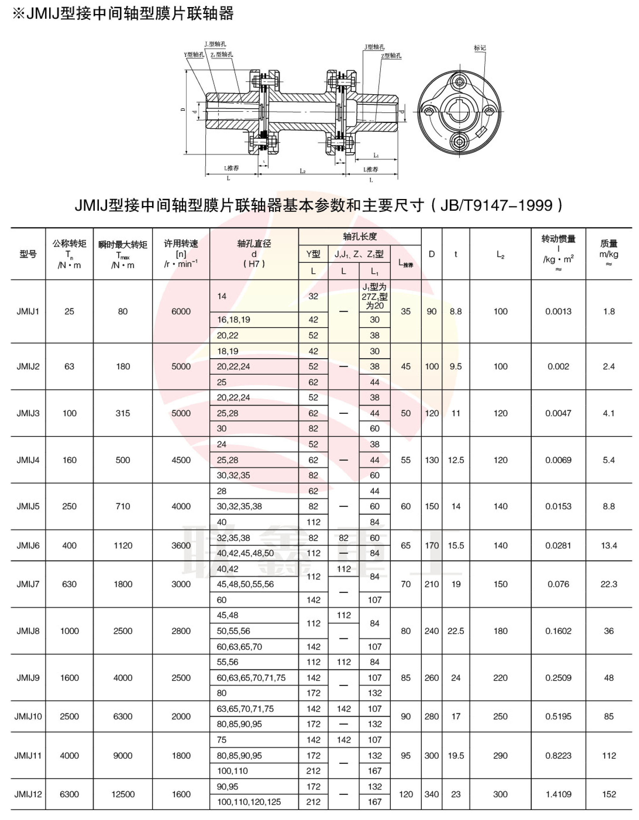 JMIJ膜片聯(lián)軸器 特點(diǎn)及應(yīng)用場(chǎng)合:與金屬彈性元件撓性聯(lián)軸器相比,具有機(jī)械強(qiáng)度高,承載能力大、質(zhì)量輕結(jié)構(gòu)尺寸小、傳動(dòng)效率和傳動(dòng)精度高,可靠性好、裝拆方便等特點(diǎn)。適用于中、高速、大轉(zhuǎn)矩軸系傳動(dòng)。與鼓形齒式聯(lián)軸器相比,具有無相對(duì)滑動(dòng),不需潤滑,使用壽命長、無噪聲、結(jié)構(gòu)簡(jiǎn)單等特點(diǎn).可部分代替鼓形齒式聯(lián)輔器。不受溫度和油污影響。具有耐酸、堿,防腐蝕的特點(diǎn)??捎糜诟邷?、低溫和有油、有水和腐蝕介質(zhì)的工況環(huán)境.適用于各種機(jī)械裝置載荷變化不大的軸系傳動(dòng),通用性極強(qiáng),工業(yè)發(fā)達(dá)國家已普遍采用,是我國重點(diǎn)推廣應(yīng)用的高性能撓性聯(lián)軸囂,高精度膜片聯(lián)軸器可用于高速工況。膜片聯(lián)軸器與齒式聯(lián)軸器相比,沒有相對(duì)滑動(dòng),不需要潤滑、密封,無噪聲,基本不用維修,制造較方便,可部分代替齒式聯(lián)軸器。膜片聯(lián)軸器在工業(yè)發(fā)達(dá)國家應(yīng)用已很普遍,在實(shí)際應(yīng)用中一般采用接中間軸型,以提高兩軸線偏移補(bǔ)償性能。