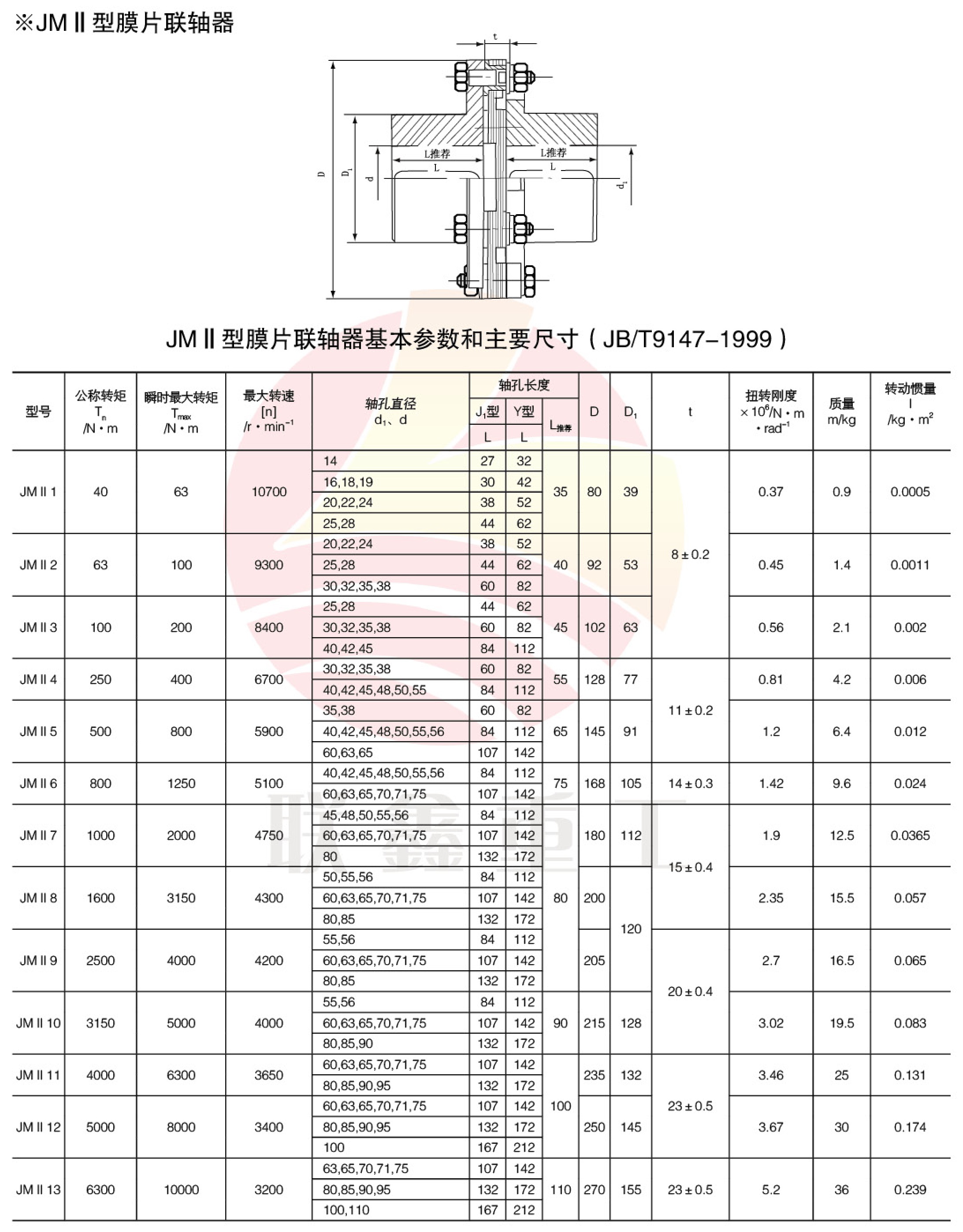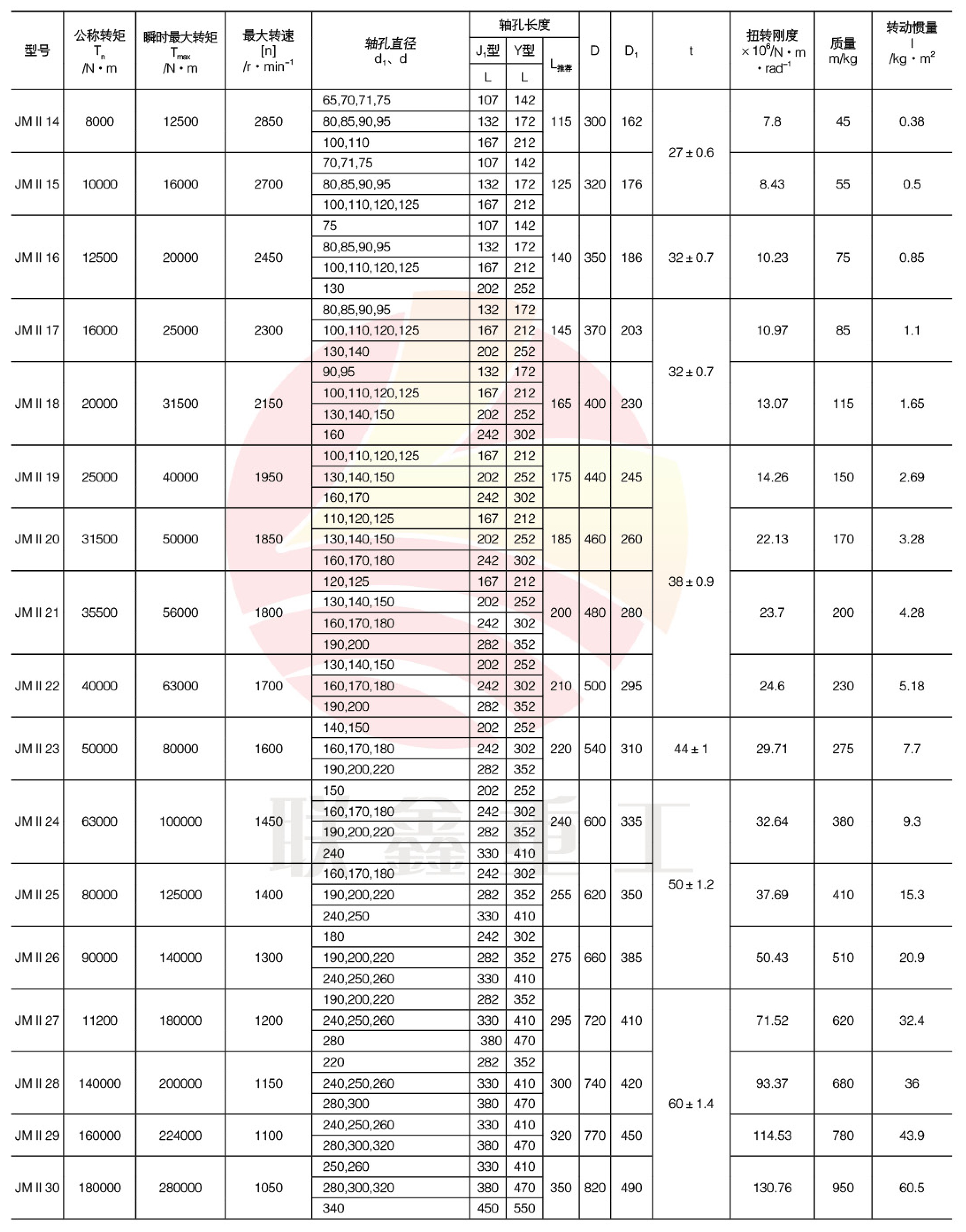 JMⅡ型膜片聯(lián)軸器 特點及應(yīng)用場合:與金屬彈性元件撓性聯(lián)軸器相比,具有機(jī)械強(qiáng)度高,承載能力大、質(zhì)量輕結(jié)構(gòu)尺寸小、傳動效率和傳動精度高,可靠性好、裝拆方便等特點。適用于中、高速、大轉(zhuǎn)矩軸系傳動。與鼓形齒式聯(lián)軸器相比,具有無相對滑動,不需潤滑,使用壽命長、無噪聲、結(jié)構(gòu)簡單等特點.可部分代替鼓形齒式聯(lián)輔器。不受溫度和油污影響。具有耐酸、堿,防腐蝕的特點??捎糜诟邷亍⒌蜏睾陀杏?、有水和腐蝕介質(zhì)的工況環(huán)境.適用于各種機(jī)械裝置載荷變化不大的軸系傳動,通用性極強(qiáng),工業(yè)發(fā)達(dá)國家已普遍采用,是我國重點推廣應(yīng)用的高性能撓性聯(lián)軸囂,高精度膜片聯(lián)軸器可用于高速工況。膜片聯(lián)軸器與齒式聯(lián)軸器相比,沒有相對滑動,不需要潤滑、密封,無噪聲,基本不用維修,制造較方便,可部分代替齒式聯(lián)軸器。膜片聯(lián)軸器在工業(yè)發(fā)達(dá)國家應(yīng)用已很普遍,在實際應(yīng)用中一般采用接中間軸型,以提高兩軸線偏移補(bǔ)償性能。