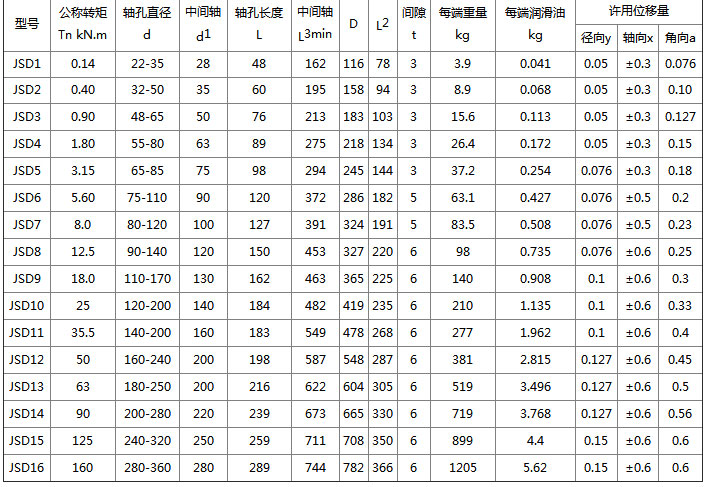 JSD型蛇型彈簧聯軸器 特點及應用場合:與金屬彈性元件撓性聯軸器相比,具有機械強度高,承載能力大、質量輕結構尺寸小、傳動效率和傳動精度高,可靠性好、裝拆方便等特點。適用于中、高速、大轉矩軸系傳動。與鼓形齒式聯軸器相比,具有無相對滑動,不需潤滑,使用壽命長、無噪聲、結構簡單等特點.可部分代替鼓形齒式聯輔器。不受溫度和油污影響。具有耐酸、堿,防腐蝕的特點??捎糜诟邷?、低溫和有油、有水和腐蝕介質的工況環(huán)境.適用于各種機械裝置載荷變化不大的軸系傳動,通用性極強,工業(yè)發(fā)達國家已普遍采用,是我國重點推廣應用的高性能撓性聯軸囂,高精度膜片聯軸器可用于高速工況。膜片聯軸器與齒式聯軸器相比,沒有相對滑動,不需要潤滑、密封,無噪聲,基本不用維修,制造較方便,可部分代替齒式聯軸器。膜片聯軸器在國際上工業(yè)發(fā)達國家應用已很普遍,在實際應用中一般采用接中間軸型,以提高兩軸線偏移補償性能。