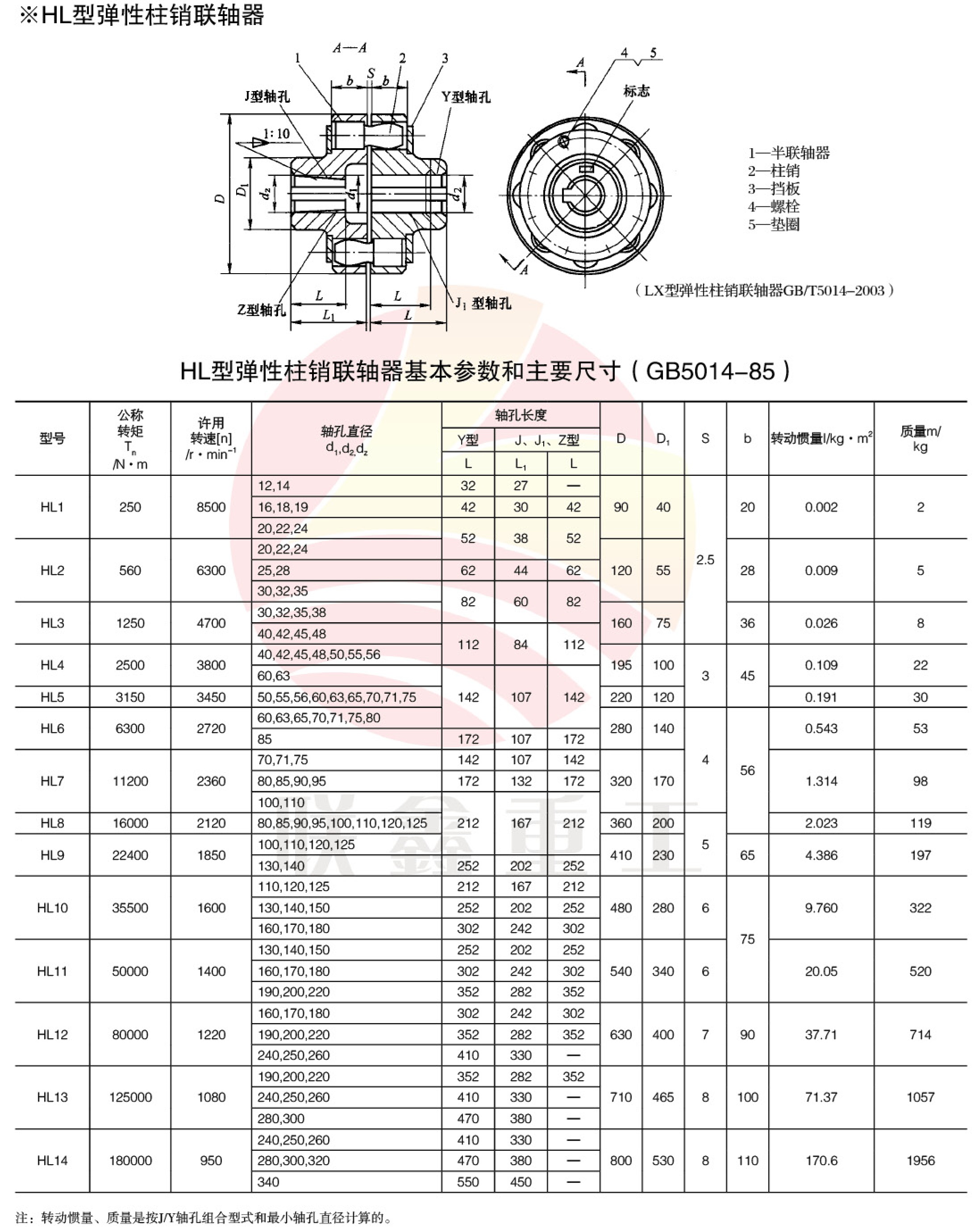 HL型彈性柱銷聯(lián)軸器簡稱“彈性柱銷聯(lián)軸器”屬于柱銷聯(lián)軸器的一種具有較大結(jié)構(gòu)簡單、合理,維修方便、兩面對稱可互換,壽命長,允許較大的軸向竄動,具有緩沖、減震等性能。HL型彈性柱銷聯(lián)軸器軸孔型式有:圓柱形(Y)、圓錐形(Z)和短圓柱形(J)。軸孔和鍵槽按國家標(biāo)準(zhǔn)GB3852-83《聯(lián)軸器軸柱和鍵槽形式及尺寸》的規(guī)定加工。HL型彈性柱銷聯(lián)軸器也成尼龍柱銷聯(lián)軸器的主體采用45#鑄鋼精密鑄造成型,軸孔和鍵槽采用拉制成型,彈性柱銷采用MC尼龍車削制成。有微量補償兩軸線偏移能力,彈性件工作時受剪切,工作可靠性較弱,適用于要求很低的中速傳動軸系,不適用于工作可靠性要求較高的工況。 |